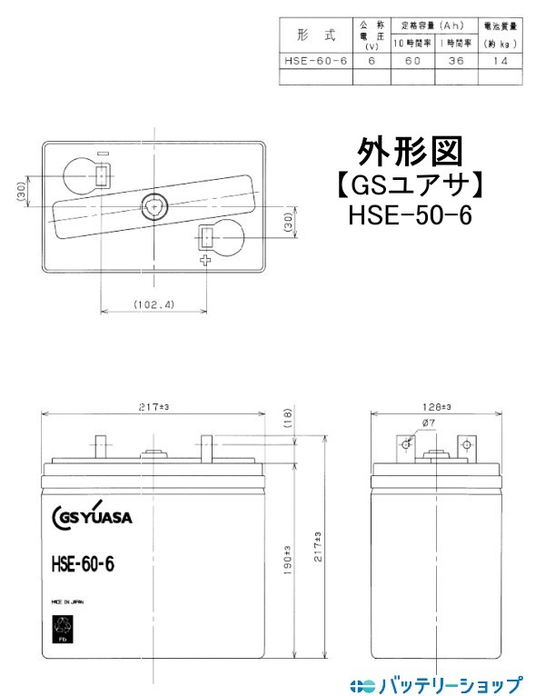【古河電池】 HSE-60-6 制御弁式据置鉛蓄電池 6V 60Ah